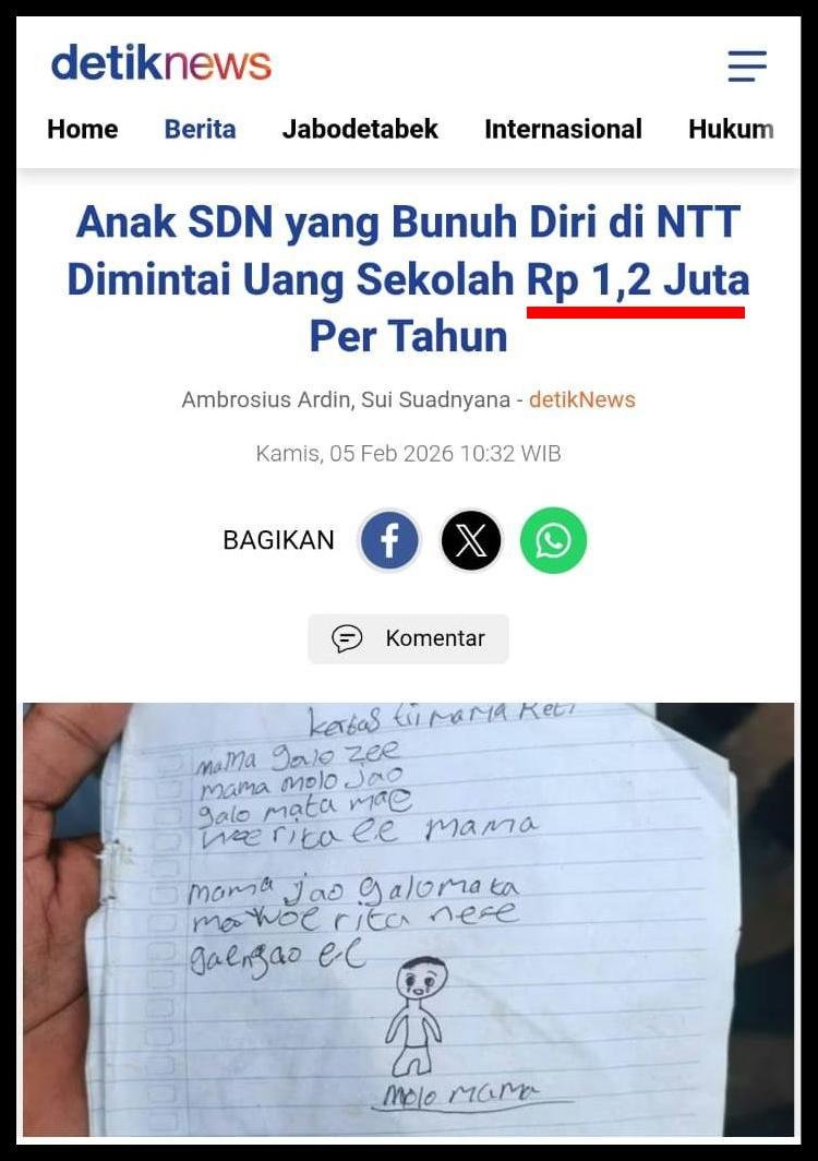 Anak SDN yang bunuh diri di NTT dimintai uang sekolah Rp 1,2 juta per tahun.